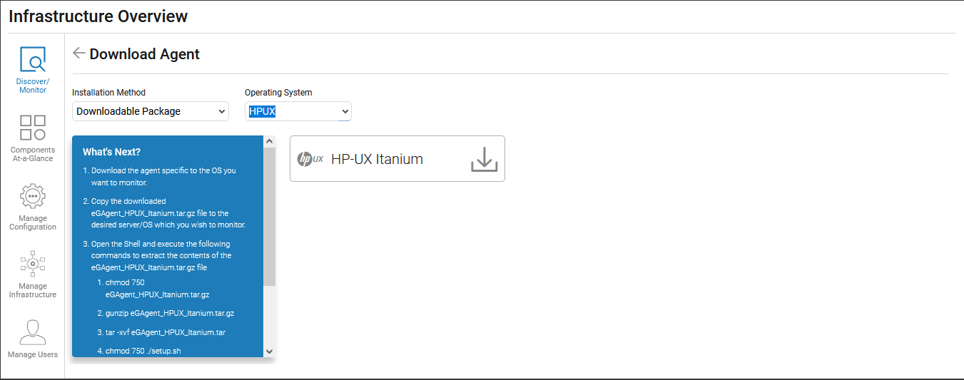 Download the agent packages / zip files that correspond to the hosts in your tenant's environment, to any folder on the eG manager host. The HP-UX agent for Itanium package will be listed therein as HPUX_Itanium.tar.gz.