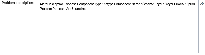 The Problem Description, as you can see, is characterized by a list of label : variable pairs. In each pair, the 'label' is a static value that qualifies/describes the value of the 'variable' that follows. The 'variable' on the other hand will be substituted at run time by relevant alert information. For instance, in the pair Alert Description : $pdesc, 'Alert Description' is the static label that will be sent as is to SMAX. This label implies that the value that follows it will be a brief problem description. The variable $pdesc will be replaced at run time by the actual problem description contained within the corresponding alarm. You can change 'labels' if you so need, but you are advised against changing the variable names.