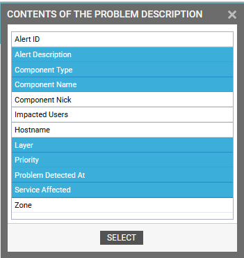 Say, you want the problem description to include the name of the business service that was impacted by the problem condition. In this case, select Service Affected from Figure 6 and click the SELECT button. The Problem description will then change accordingly.
