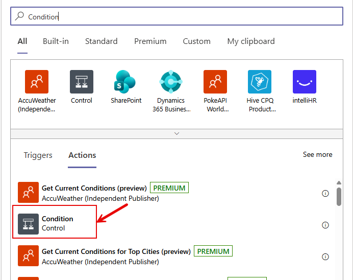 Figure 43 will then appear. Type 'Condition' in the Search text box in Figure 43, and click on the Condition action when it appears in the search results (as indicated by Figure 41).