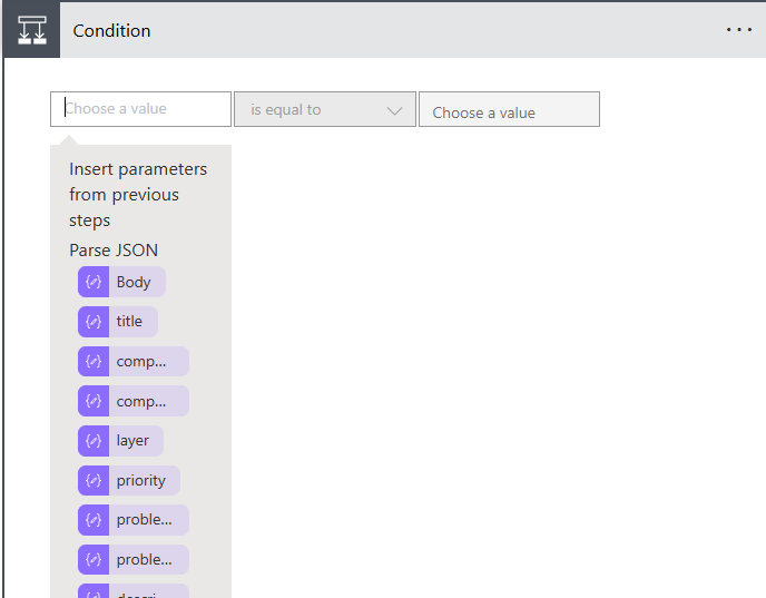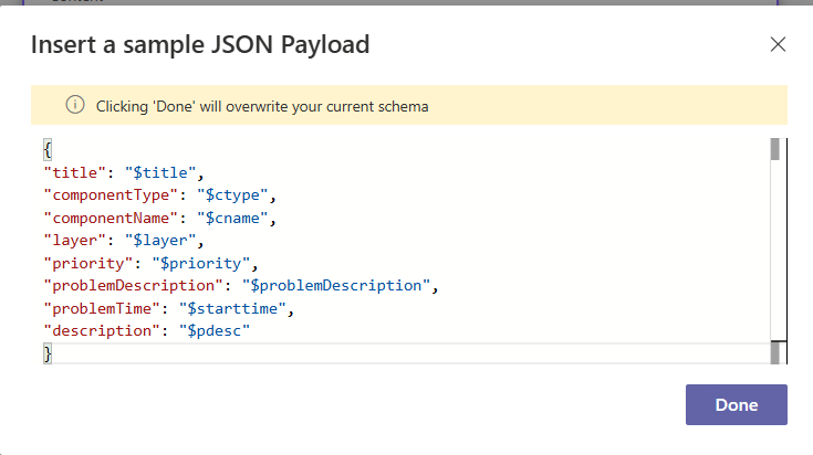 If new fields are added to the Incident Title, Problem description, or Custom Payload, or if the status of the Use Adaptive card layout parameter is changed, or if existing fields are modified or removed in the Incident Title, Problem description, or Custom Payload, it is necessary to regenerate the payload and update. After generating the payload, copy and paste it into the "Parse JSON" action in the workflow.