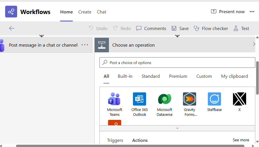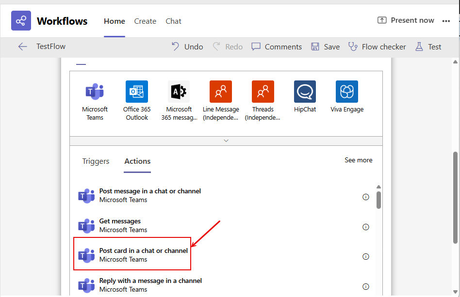 Figure 39 will then appear. Locate the Post card in a chat or channel option in the Actions list of Figure 39 and click on it.