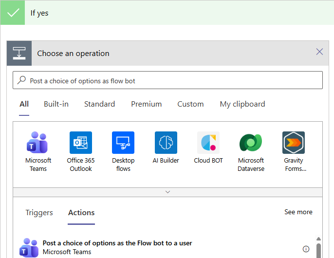 Figure 47 will then appear. In our case, the 'If yes' condition is to send 'reminder messages' to a specific user. In other words, if the eG-MS Teams integration has been set to escalate outstanding issues to managers via reminder messages, then the 'If yes' action is to instruct the workflow to send these messages to a specific user. For that, type 'Post a choice of ' in the Search text box in Figure 47, and click on the Post a choice of options as the Flow bot to a user action that appears in the search results.