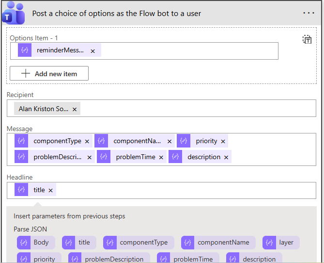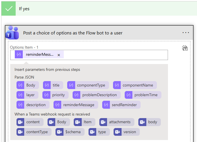 Next, proceed to configure the body of the reminder Message. For this, you can pick parameters from the dynamic content that is generated from the prased JSON payload - e.g., componentName, componentType etc.