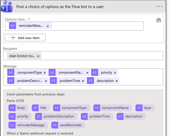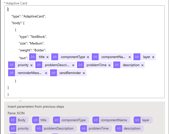 Note that when posting 'reminder messages', the payload you copy to and then from the Adaptive card designer will include the sendReminder and reminderMessage parameters. These parameters therefore will be available for inclusion against the "text" parameter (see Figure 42).