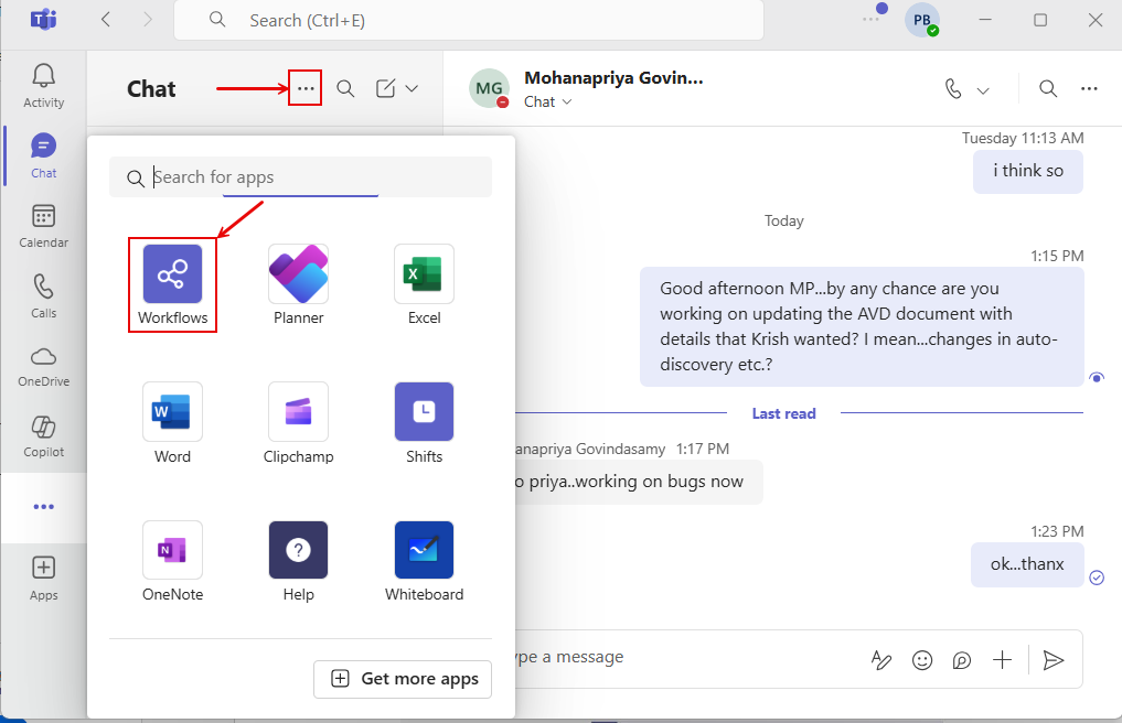 Launch the Microsoft Teams app. Click on the 'three dotted icon' (indicated by Figure 3) to view the list of apps that Teams offers. If you find 'Workflows' in that list (see Figure 3), click on it. If you are unable to locate 'Workflows', then search for the same using the 'Search for apps' text box in Figure 3.