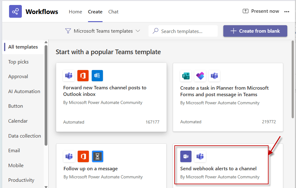 Figure 5 : Choosing to create a workflow that sends webhook alerts to a channel