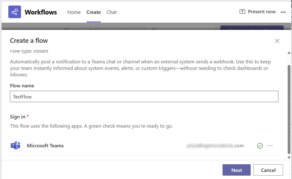 Figure 6 will then appear. Specify the Flow name in Figure 6. Then, you need to authenticate the flow, so it has the permission necessary to send web hook alerts to a Teams channel. For that, you need to configure the flow with a valid Teams account. If the flow is successfully authenticated, a 'tick' mark will appear alongside. Then, click on the Next button to proceed.