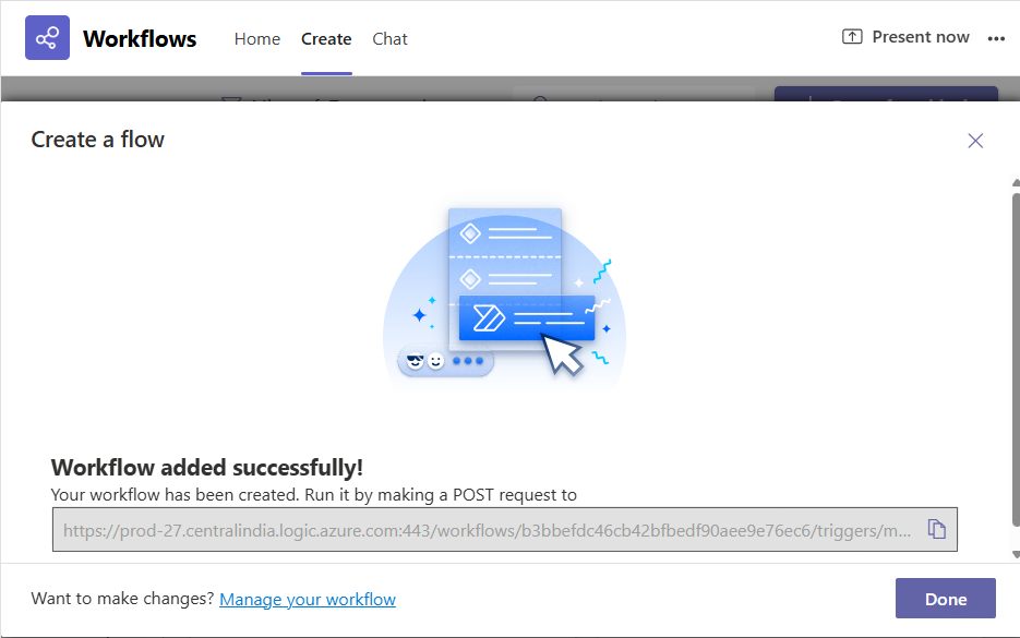 Upon successful creation of the workflow, the webhook URL will be displayed (see Figure 8). Copy the URL to Notepad, as you will need it when configuring the eG Enterprise system.