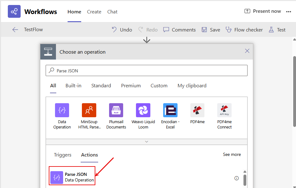 Edit the Workflow created at step 1 to parse JSON action;