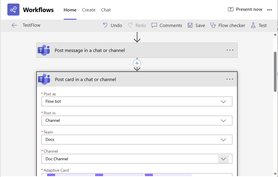 Configure the Workflow created at step 1 to post messages in a channel or to post card in a chat or channel