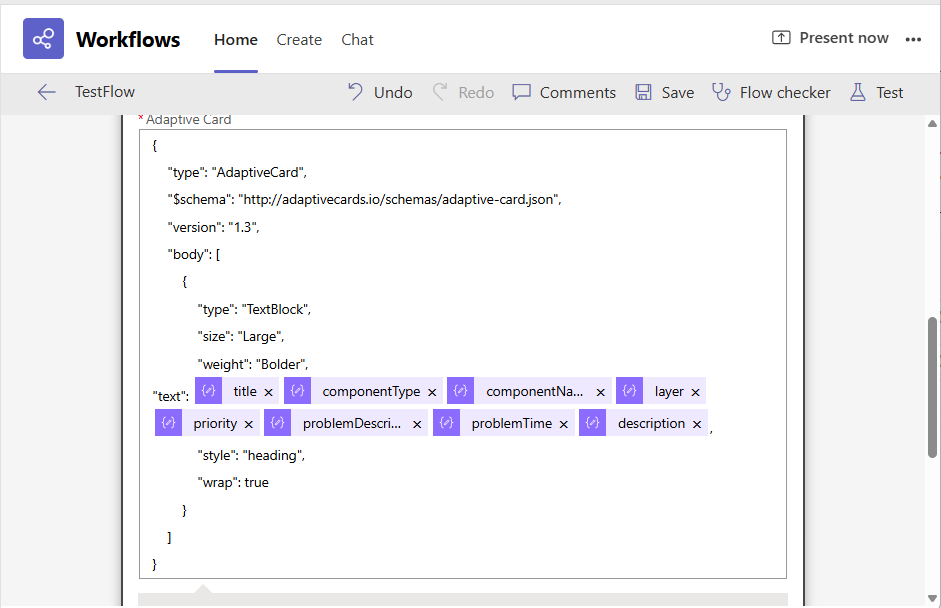 Figure 22 : The generated JSON Payload after the Use Adaptive card layout is set to Yes