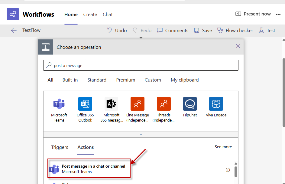 Figure 34 : Selecting the 'Post message to a chat or channel' option