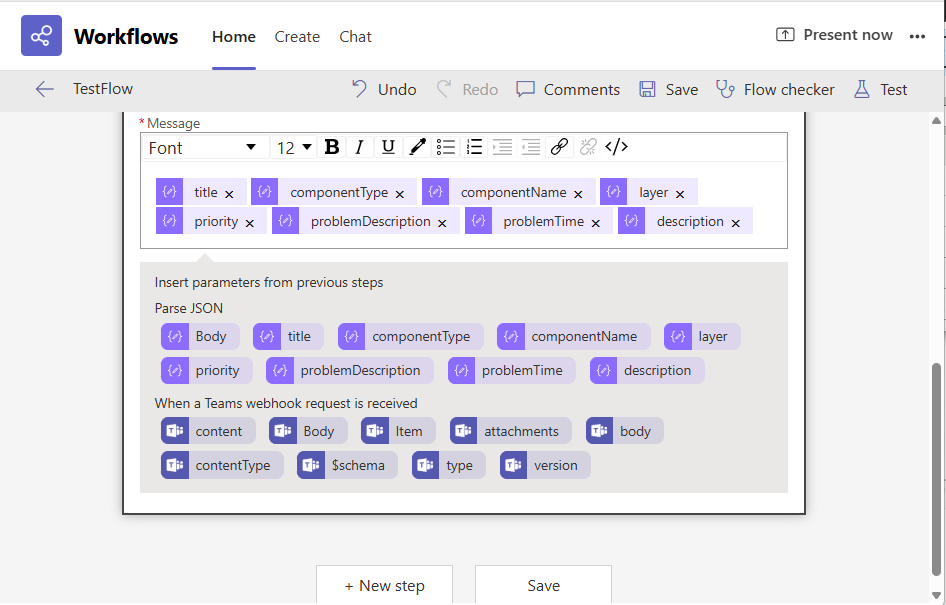 Finally, place your cursor inside the Message text area to configure the message to be posted. Doing so will make all properties of the Parse JSON action to be available for inclusion in the message body (see Figure 36). Select the properties that you want included in the message body and click the Save button.