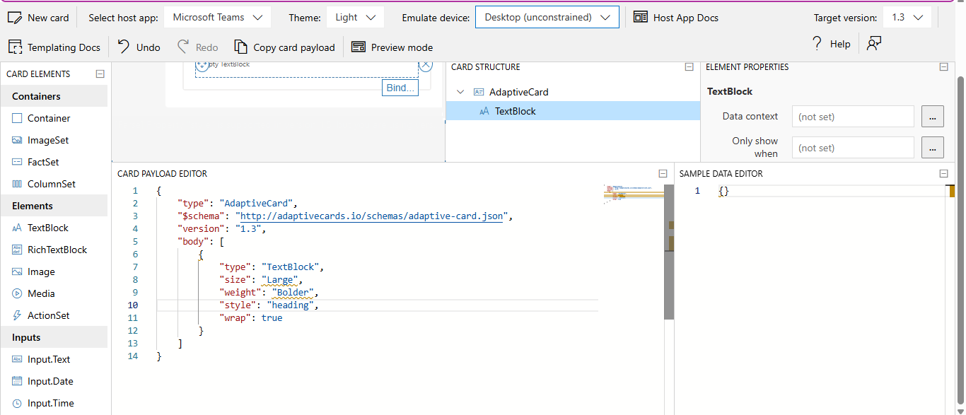 Use the https://adaptivecards.io/designer to visually build an Adaptive card. Figure 38 illustrates an Adaptive card being designed using the designer. While designing the card, make sure you use Adaptive Card version 1.3 and select host app as Microsoft Teams. Also, drag and drop the specified elements and configure the properties of the card.