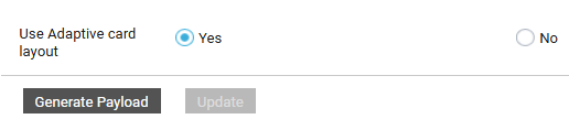 To implement option (b) above, you need to first design the layout of the Adaptive card using a card designer. Then, you need to set the Use Adaptive card layout flag to Yes.