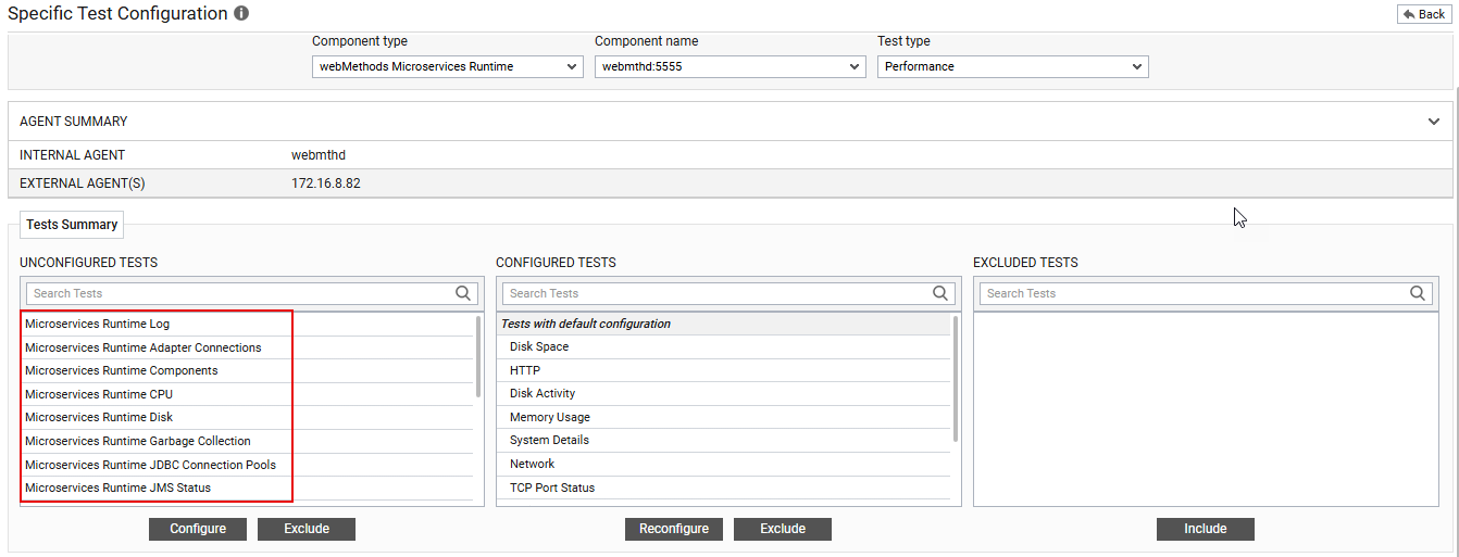 Figure 373 : The list of unconfigured tests for the webMethods Microservices Runtime