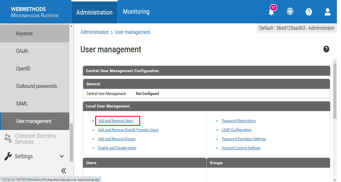 For monitoring webMethods Microservices Runtime server, you need to create a user account and assign a group to the user in the webmethod integration console. The steps on how to create user account and assigning a group to the user in webmethods integration console are discussed below.