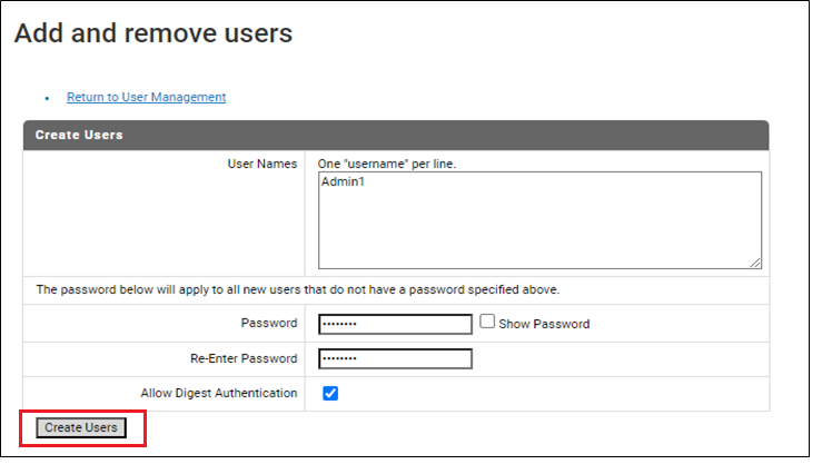 In the Create Users section, specify the User Names (one user name entry per line) and provide the user Password/Re-Enter password in the respective text boxes for those users. Enable the Allow Digital Authentication option and click Create Users button (see Figure 2).