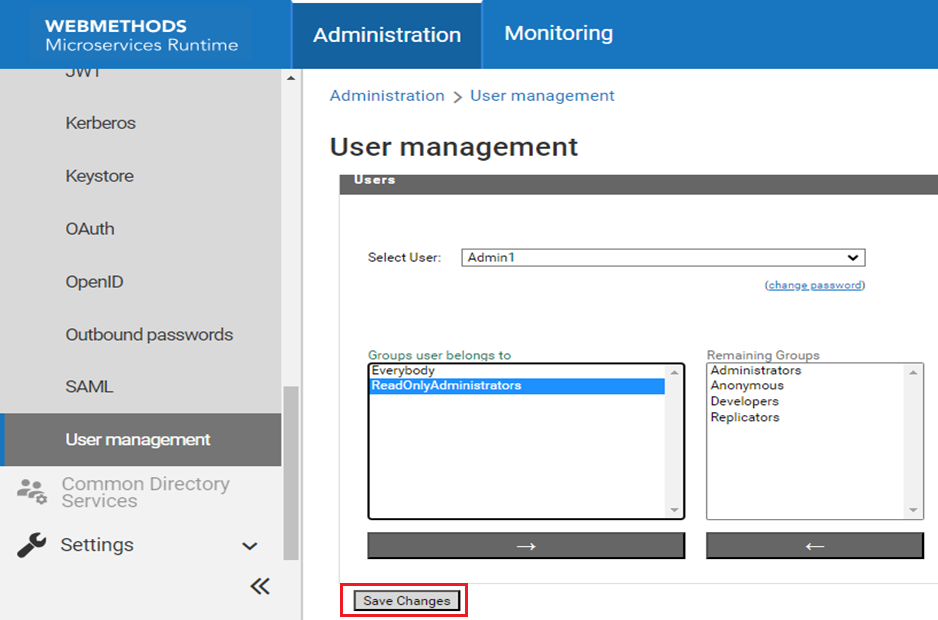 Navigate to Users section in User Management page (see Figure 3). Now, select the user from Select User drop down list, choose the required user group from Remaining Groups selection box and then click the left arrow button to add the selected user to the Groups user belongs to selection box.
