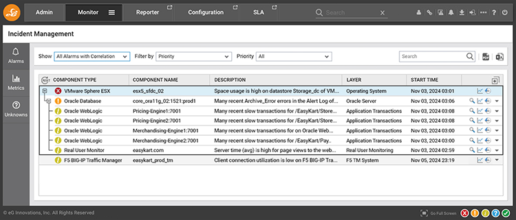 eG Enterprise’s AIOps engine groups and prioritizes alerts to avoid alert storms with secondary effects ranked lower priority than the primary root cause. Here a VMware server failure was identified as the root-cause of many Oracle failures