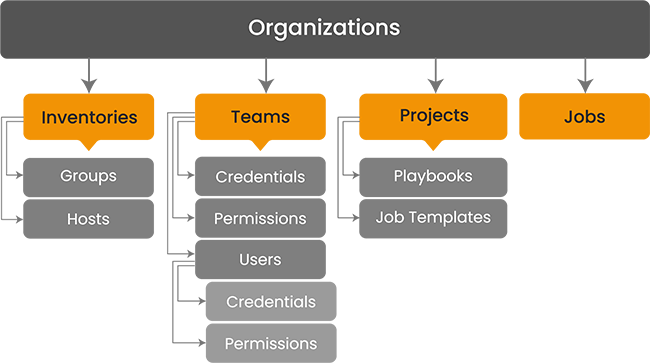 Ansible Automation Controller offers multilevel access delegation and role-based access control to an organization. The organization is nothing but a logical collection of Users, Teams, Projects, and Inventories. It is the highest level in the Ansible Automation Controller object hierarchy. To support multiple clients from one umbrella, you could create an organization for each client and manage multiple teams under that. The following figure gives you a pictorial representation of the organization hierarchy in the Ansible Automation Controller.