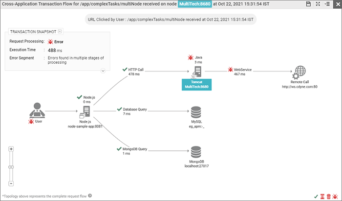 • Distributed Transaction Flow analysis leverages a tag-and-follow technique to trace transactions across multiple tiers – Node.js and other (Java, PHP, .NET) APM tiers.