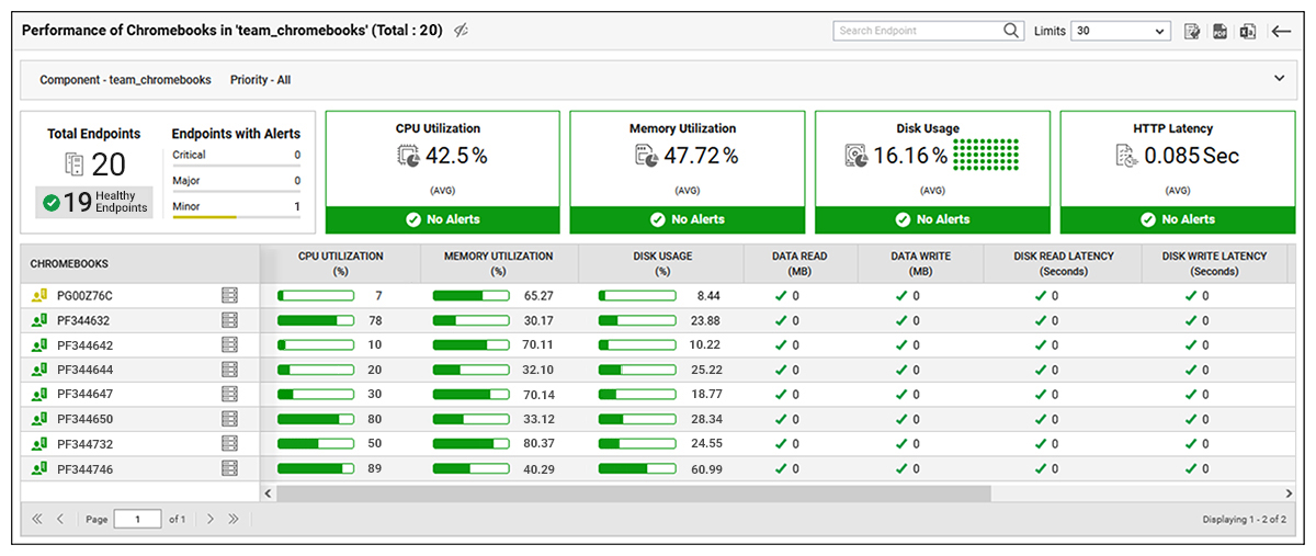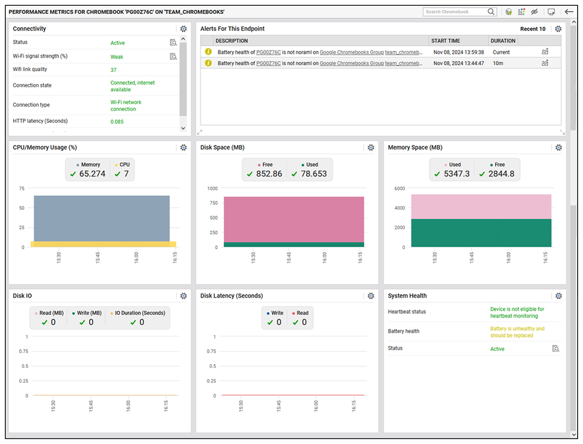 Like all endpoints, the user experience when using a Chromebook can be impacted by resource limitations such as CPU or RAM. Chromebooks can be particularly sensitive to networking problems due to their inherent reliance on cloud-based apps and services. Chromebooks need to be continuously monitored to ensure compliance, security, peak performance, and user productivity.