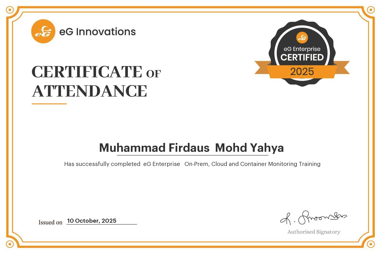 Has successfully attended eG Enterprise On-Prem, Cloud and Container Monitoring Training